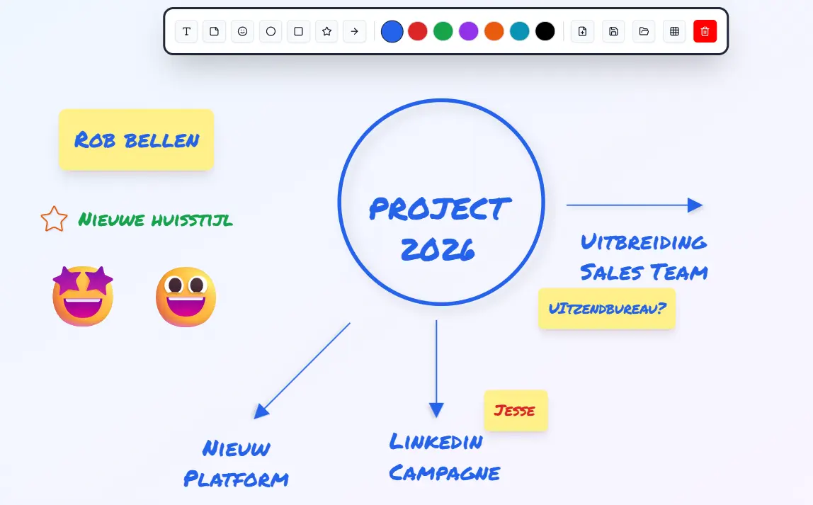 Jouw gratis digitale whiteboard om op te plannen en te noteren op een visueel aantrekkelijke manier. Je kan er van alles op kwijt inclusief emoji's en sticky notes.